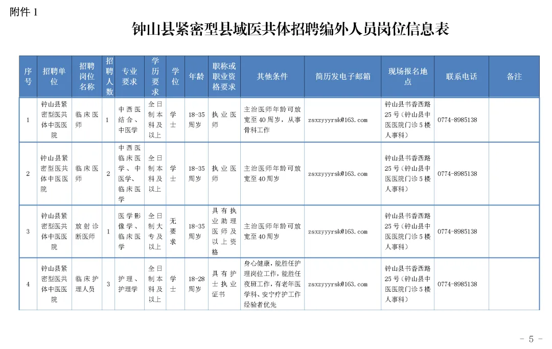 5.崗位具體信息及要求詳見附件1《鐘山縣緊密型縣域醫共體招聘編外人員崗位信息表》(如下圖)。