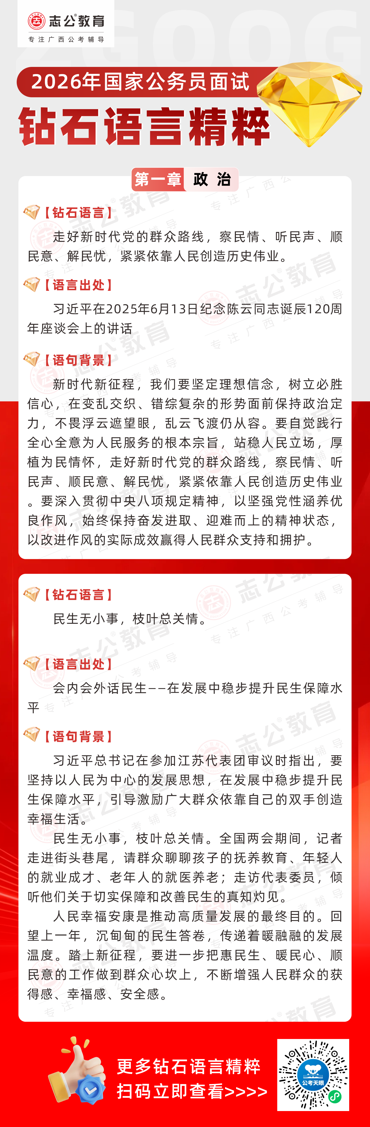 志公教育推出《2026國家公務員面試·鉆石語言精粹》政治篇!幫助考生把握政治類題目應答邏輯,提升語言表達層次,助你在面試中脫穎而出。備考2026國考面試,從掌握“鉆石語言”開始!