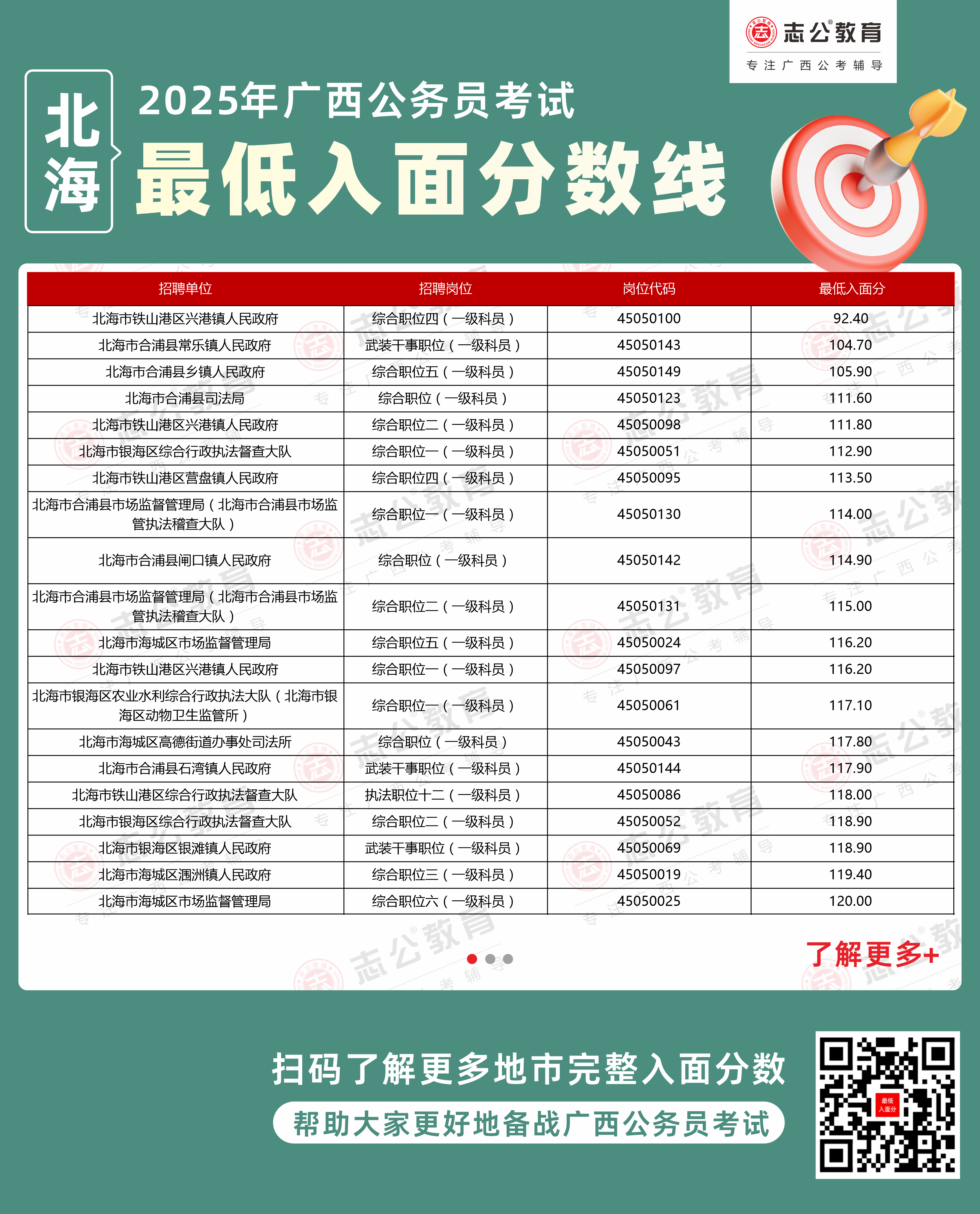以下為志公教育根據官方公布的面試資格審查公告及擬錄用人員公示整理的北海市部分單位的進面最低筆試分數(含照顧加分),數據僅供參考,具體以官方實際公布為準。