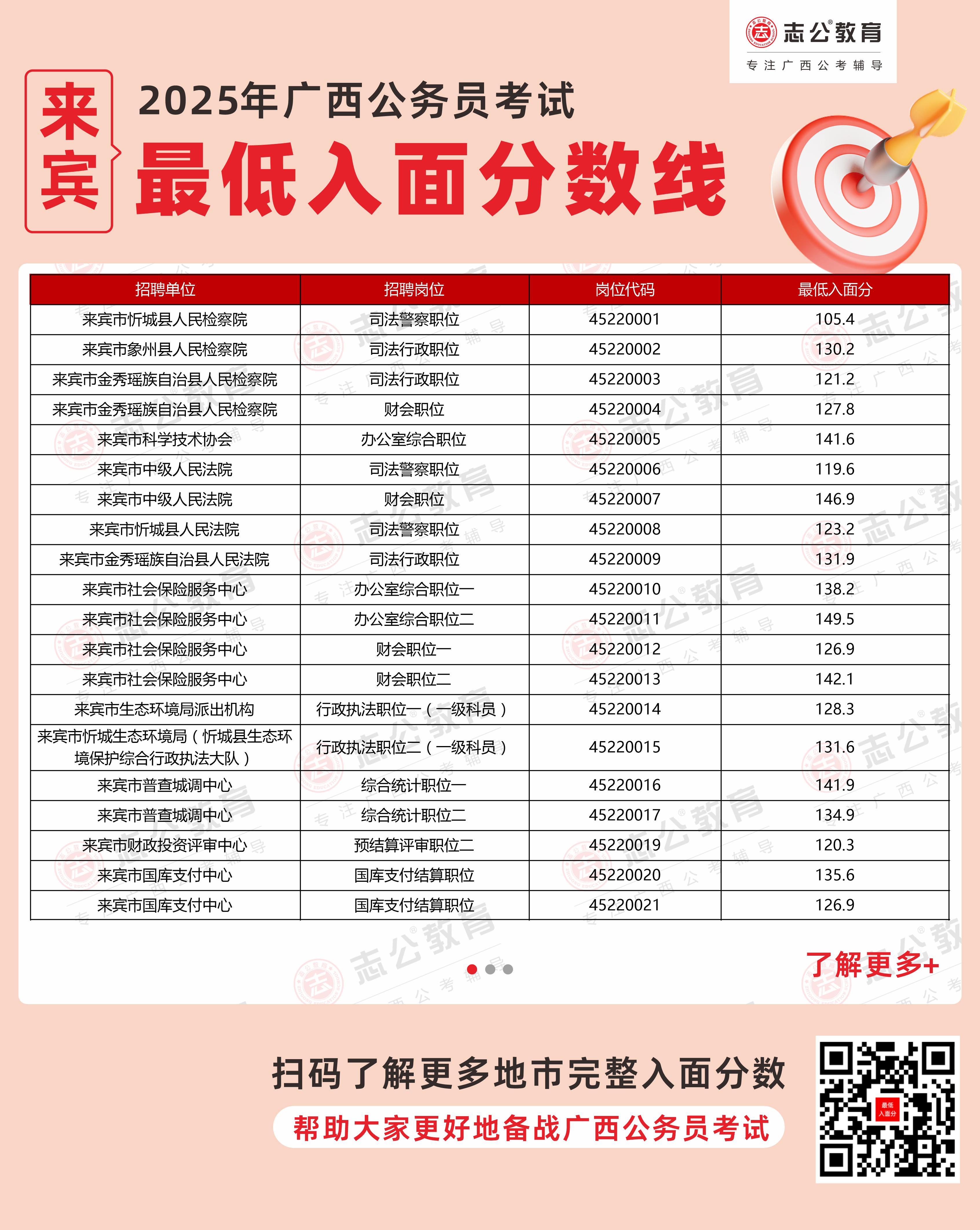 以下為志公教育根據官方發布的面試資格審查名單整理的來賓市部分單位的進面最低筆試分數(含照顧加分),數據僅供參考,具體以官方實際公布為準。